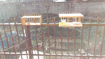 冬の窓 メジロ待ってる 餌箱で